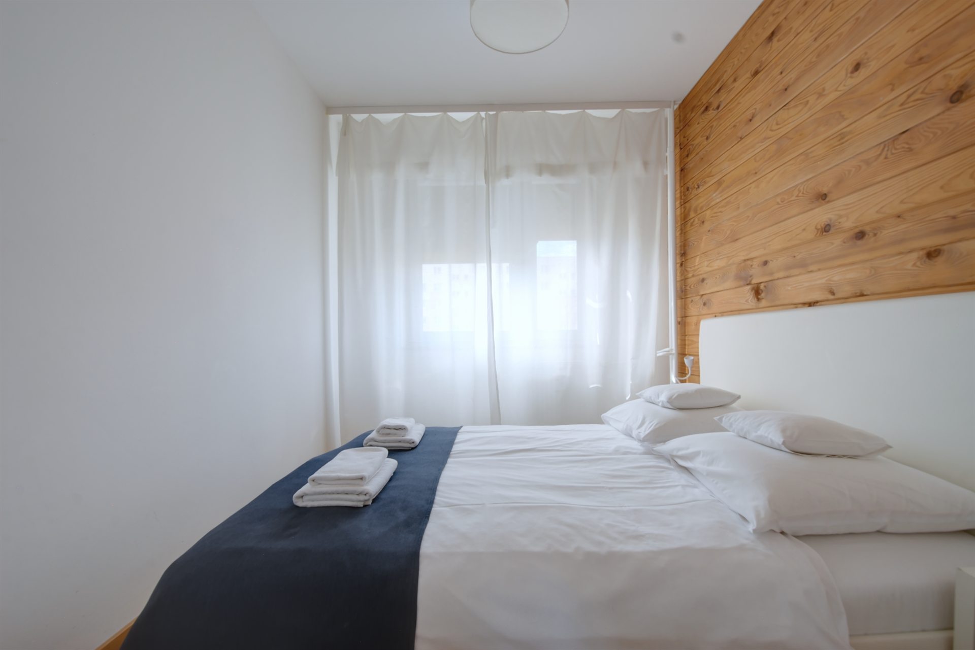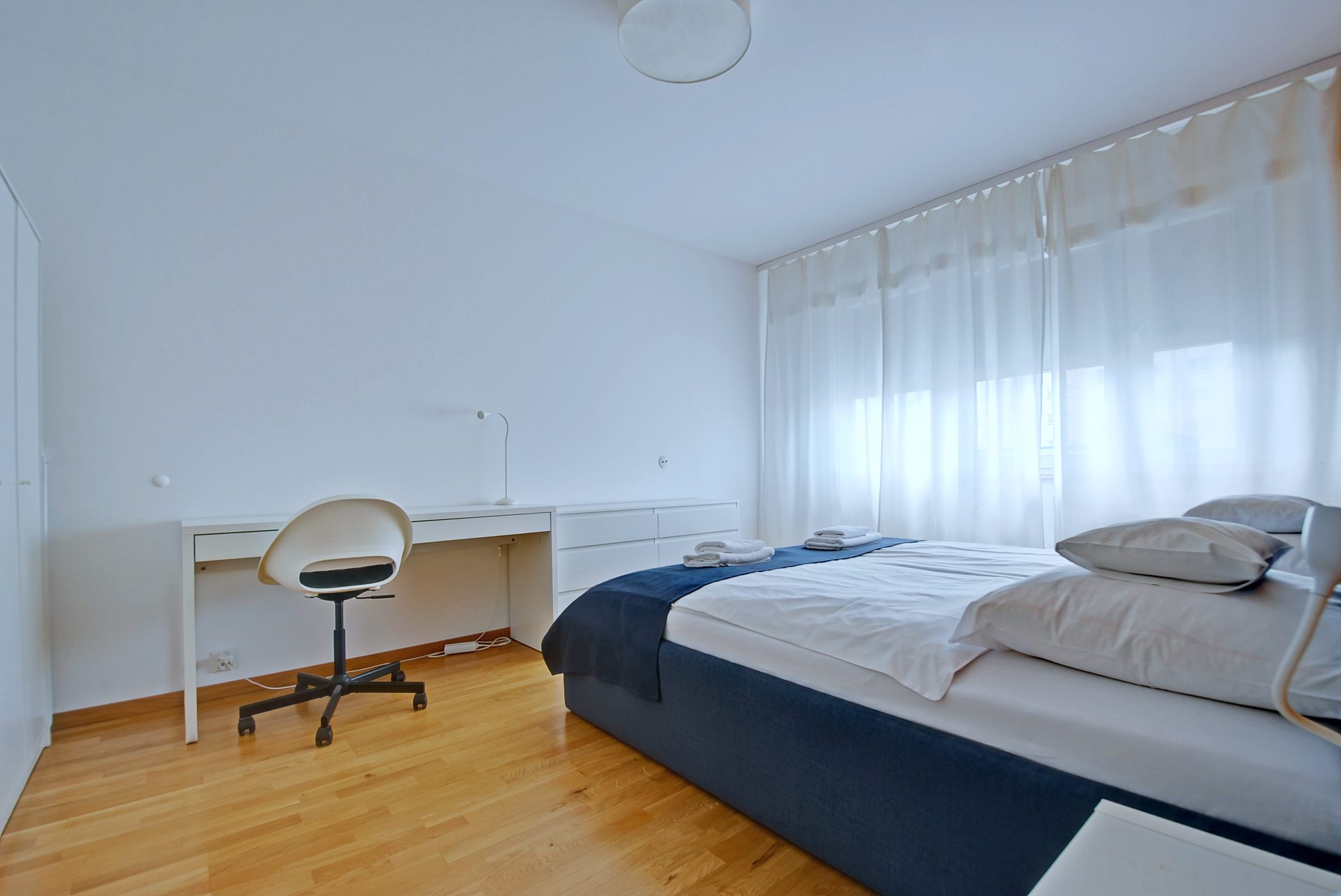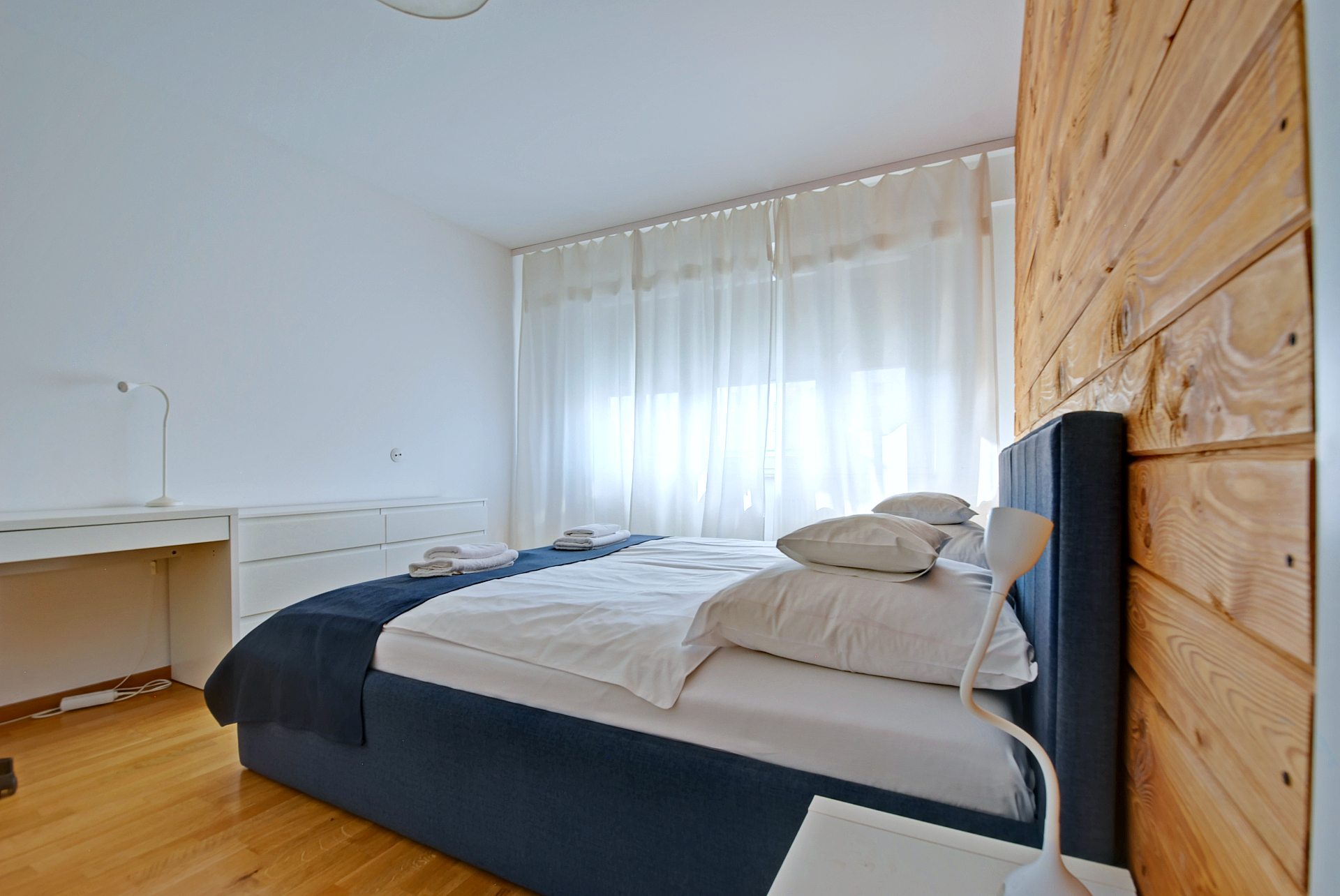 - Dwie sypialnie – jedna z łóżkiem małżeńskim (180 cm), druga z dwoma łóżkami pojedynczymi (80 cm), które można połączyć w jedno duże,