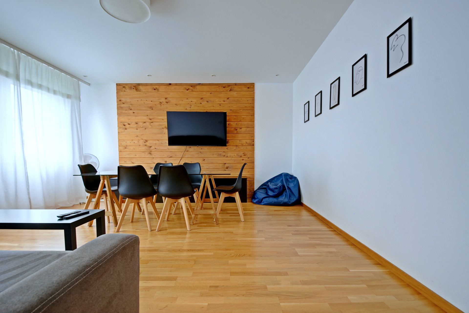 - Przestronny salon z dużym stołem, rozkładaną sofą, stolikiem kawowym i telewizorem,